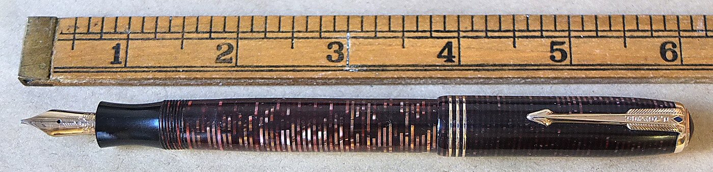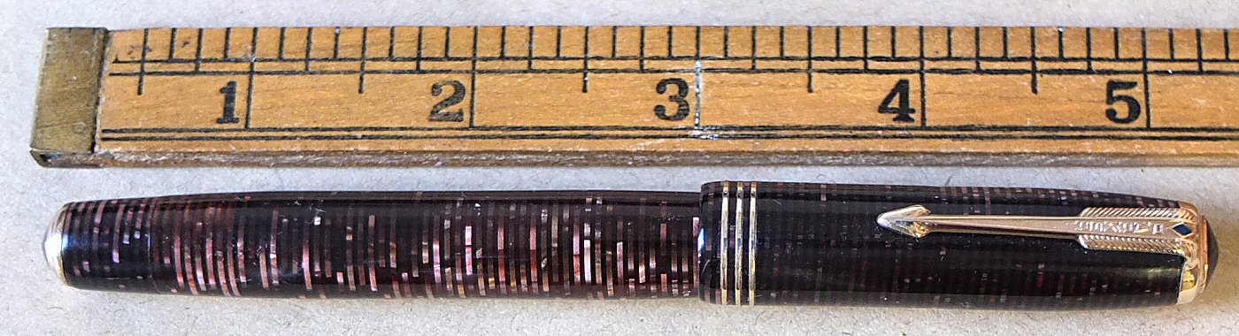 A JUNIOR Big-Red Lucky-Curve Duofold - Canadian manufacture -with the number 3 printed on the blind-cap (? a Parker numbering system that we've not seen, or noticed, before) (click on the images below for larger pictures) ![]() with later replacement 14K MEDIUM nib click HERE and HERE for pictures of the nib ![]() |
