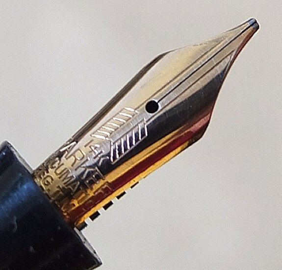 A not-so-often-found DEBUTANTE Vacumatic (3rd generation) (click on the images below for larger pictures) ![]() with what we presume is a later replacement New Haven MEDIUM nib (semi-flexible) - and could it have been original, if the pens were then being assembled over here ?....... click HERE and HERE for pictures of the nib ![]() |