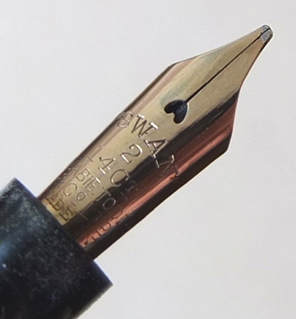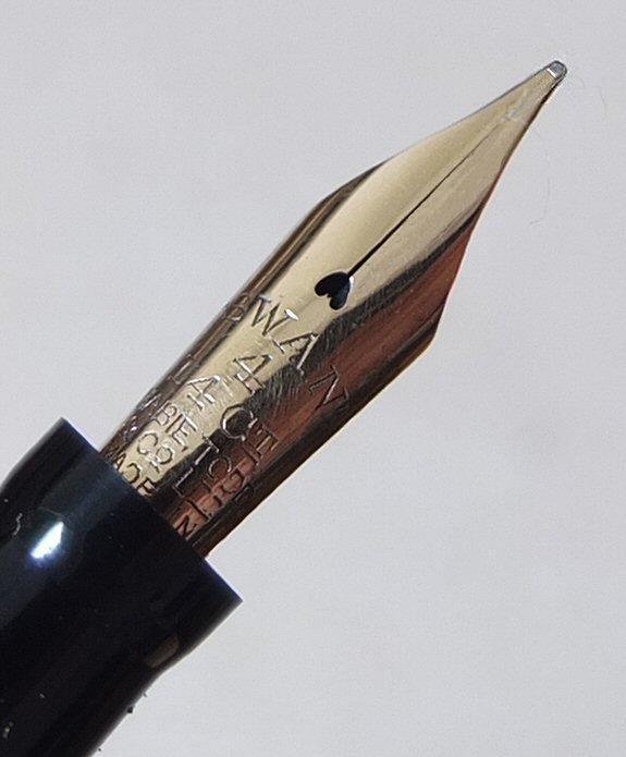 SW 586 | And here is an attractive slimmer lever-filling SWAN, which we think is a 6241 - similar to the picture on page 233 of Stephen Hull's book THE SWAN PEN. with original MEDIUM flexible No.2 nib ![]() |