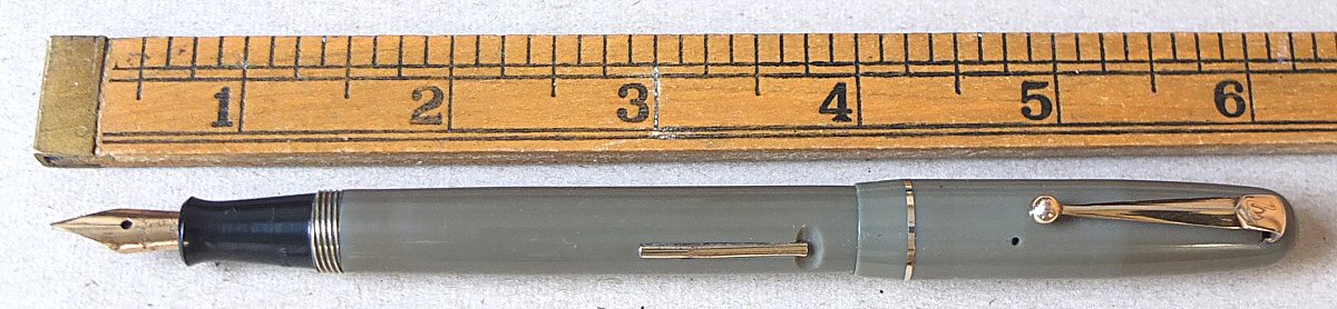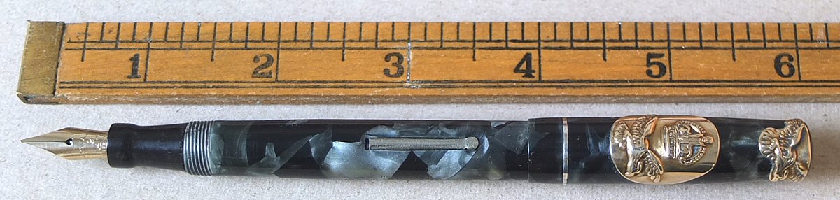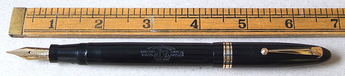 This is also a wartime pen - maybe made for use by the Air Ministry - we think that the crest might be related to the Royal air Force (perhaps someone can advise us ?). Click HERE to see the crest. (For larger pictures, please click on the images below) ![]() with original semi-flexible No.2 MEDIUM nib Click HERE and HERE for pictures of the nib ![]() |