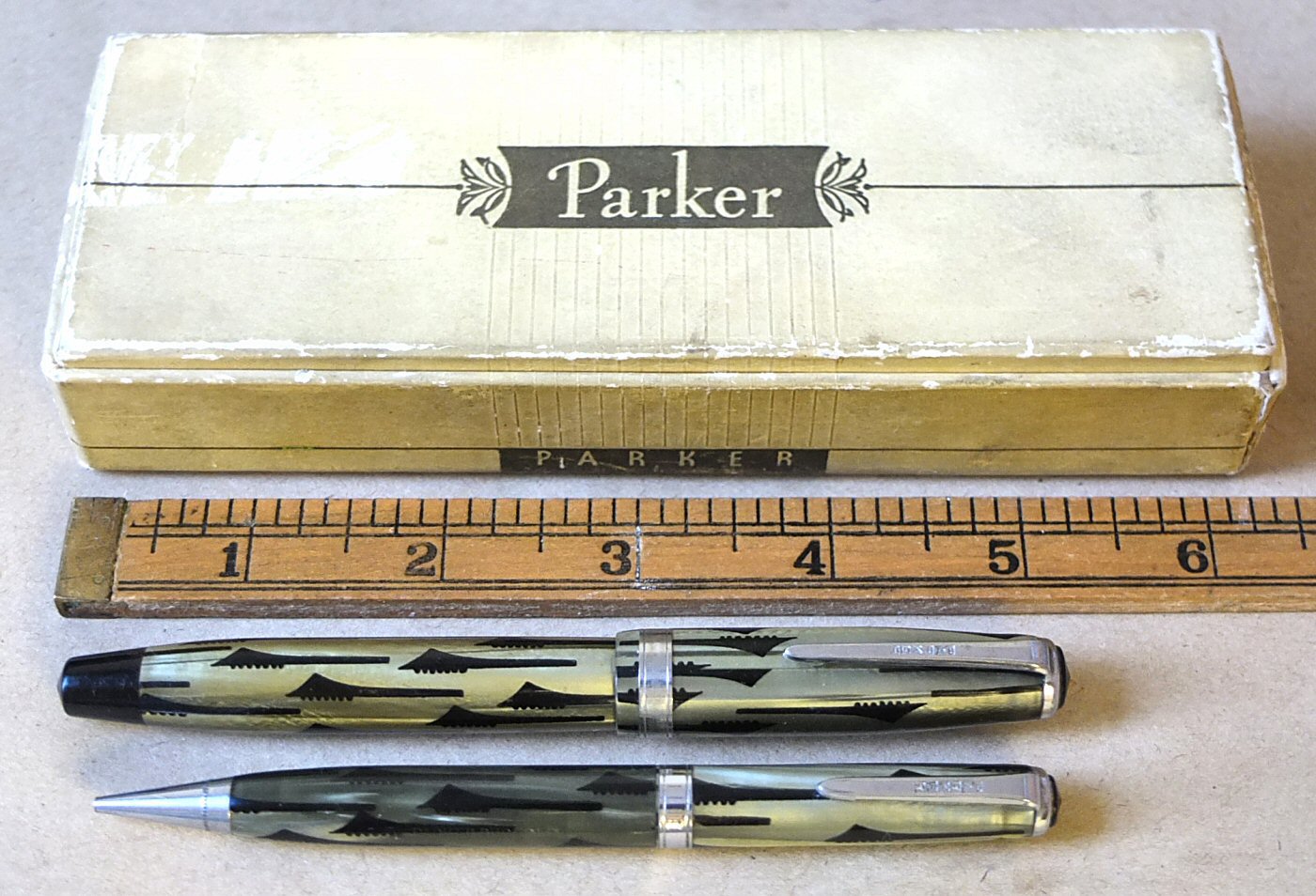 | RPA 925 | B-I-G and beautiful. This one is chunky, and the largest of the de-luxe MODERNE (Green and Black Pearl) DUOFOLDS produced in 1932 - we think it is the No.157 model, as illustrated on page 94 of David Shepherd's and Dan Zazove's PARKER DUOFOLD book. with original EXTRA FINE Canadian Duofold nib |