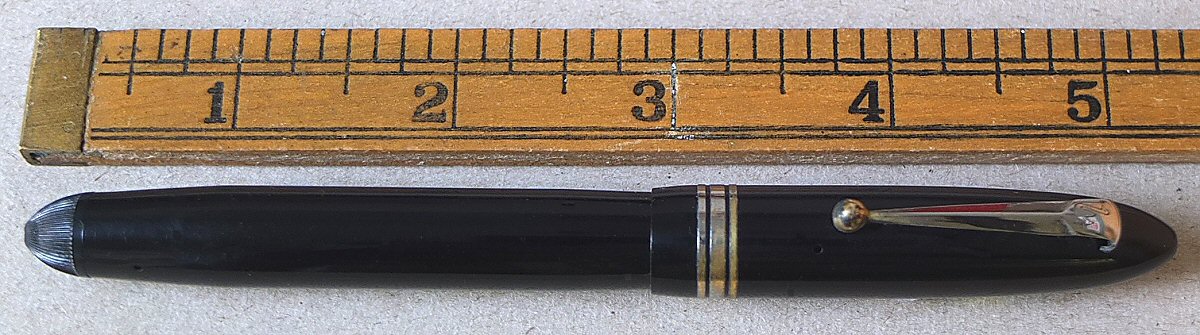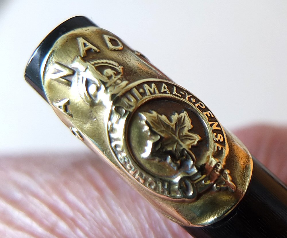 A most interesting BLACKBIRD 5261, bearing Canada's national crest, and the word CANADA around the top - probably made for use by Canadian forces over here during World War 2. Click HERE to see the crest. (For larger pictures, please click on the images below) ![]() with original BLACKBIRD FINE flexible nib Click HERE and HERE for pictures of the nib ![]() |