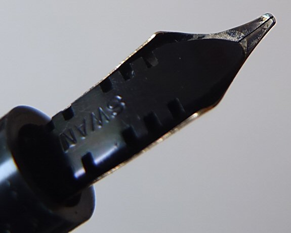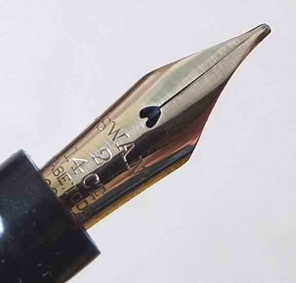 SW 586 | And here is an attractive slimmer lever-filling SWAN, which we think is a 6241 - similar to the picture on page 233 of Stephen Hull's book THE SWAN PEN. with original MEDIUM flexible No.2 nib ![]() |