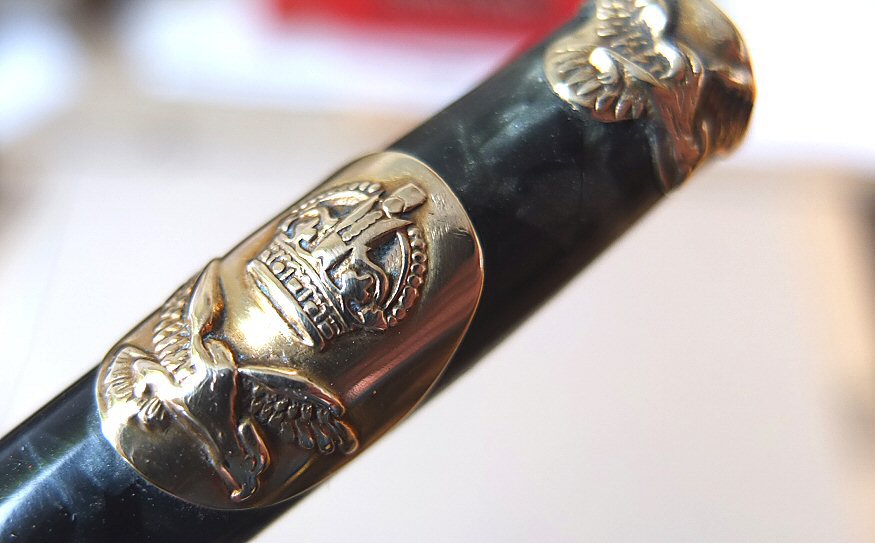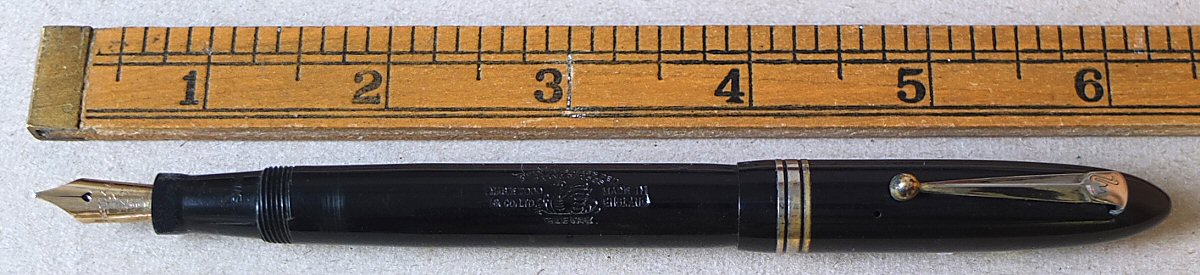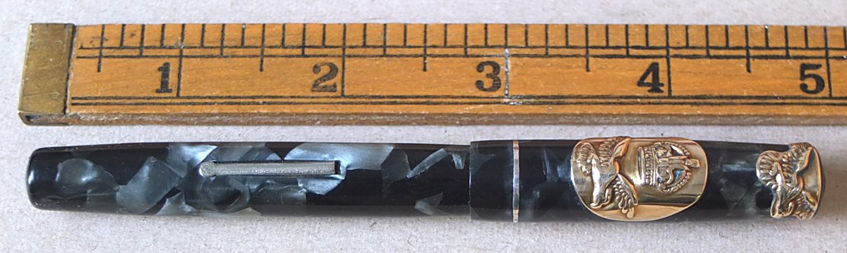 This is also a wartime pen - maybe made for use by the Air Ministry - we think that the crest might be related to the Royal air Force (perhaps someone can advise us ?). Click HERE to see the crest. (For larger pictures, please click on the images below) ![]() with original semi-flexible No.2 MEDIUM nib Click HERE and HERE for pictures of the nib ![]() |