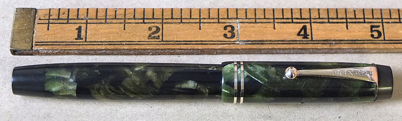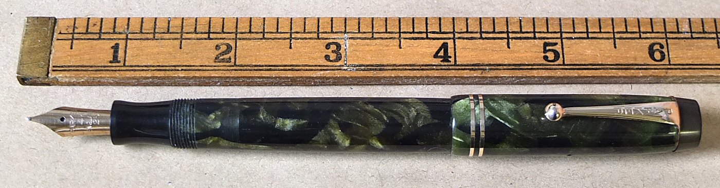 | RPA 925 | B-I-G and beautiful. This one is chunky, and the largest of the de-luxe MODERNE (Green and Black Pearl) DUOFOLDS produced in 1932 - we think it is the No.157 model, as illustrated on page 94 of David Shepherd's and Dan Zazove's PARKER DUOFOLD book. with original EXTRA FINE Canadian Duofold nib |